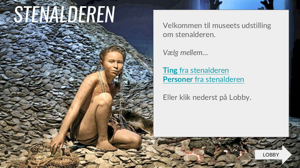 Hver udstilling består af ting og personer, fx fra Stenalderen, Vikingetiden, osv.