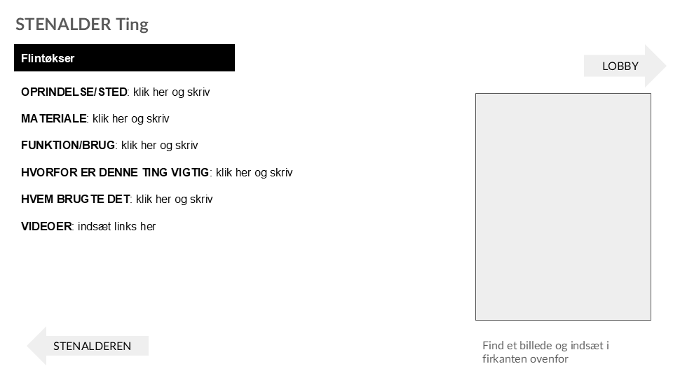 Hver elev får en kopi af en PowerPoint-fil, og skal selv over tid skabe museet med udstillinger fra de historiske perioder.